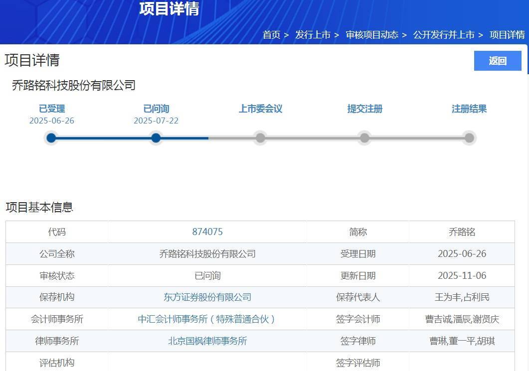 11月6日,乔路铭科技股份有限公司(以下简称“乔路铭”)在北交所网站更新上市申请审核动态,公司收到第二轮审核问询函,北交所追问的问题包括业绩增长可持续性以及收入确认的真实性等。